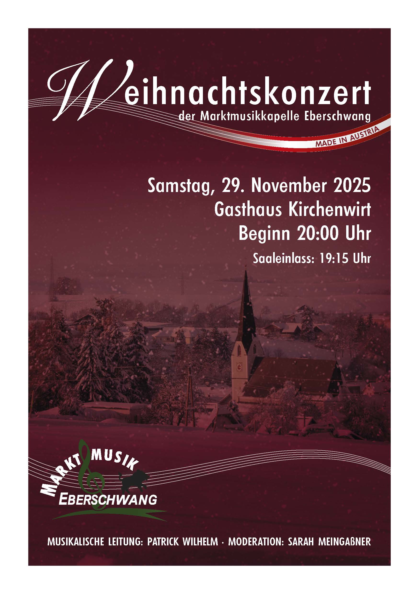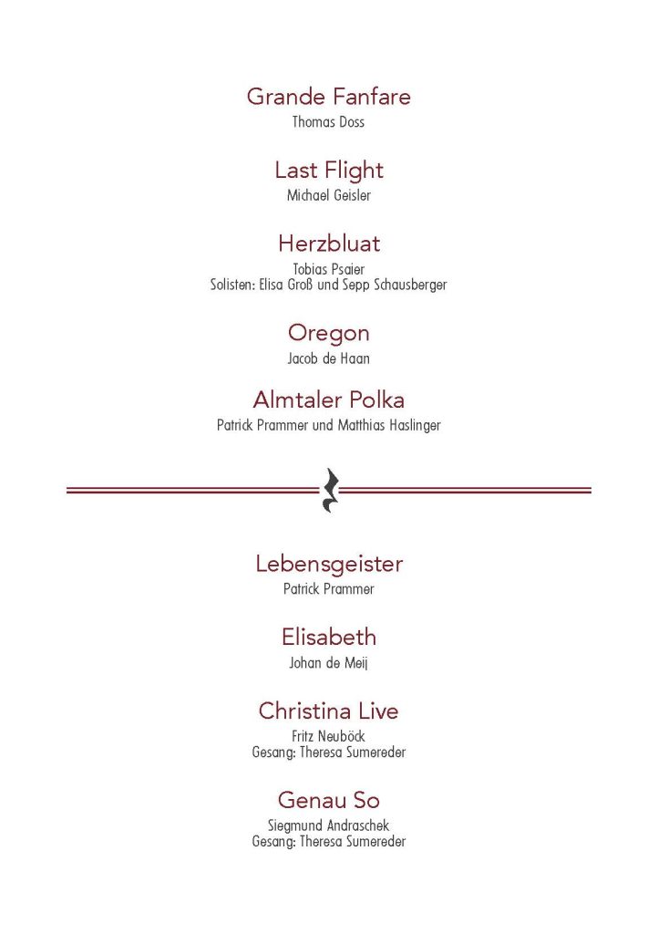 Im Mittelpunkt unseres Konzertes, das unter dem Motto “Made in Austria” steht, stehen Werke heimischer Komponisten. Ihr musikalisches Schaffen sorgt nicht nur für Abwechslung, sondern auch für so manche Überraschung. Unsere Sängerin Theresa Sumereder wird erneut ihr Gesangstalent unter Beweis stellen und damit zum Gelingen eines unvergesslichen Konzertabends beitragen.