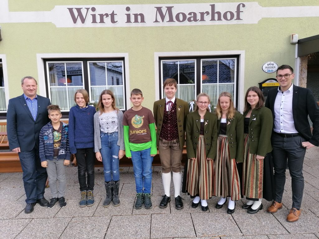 vlnr.: Vbgm. DI Martin Bögl, Jeremias Pillichshammer (Juniors, Schlagwerk), Jakob Gruber (Juniors, Klarinette), Hanna Kiehas (Juniors, Flöte), Mathias Schausberger (Juniors, Trompete), David Gadermaier (JMLA Bronze, Posaune), Laura Rohringer (JMLA Bronze, Flöte), Elisa Groß (JMLA Bronze, Trompete), Judith Pillichshammer (JMLA Silber, Saxofon), Obmann Ing. Viktor Felbermayr, (nicht am Bild: Simone Reisinger (JMLA Silber, Tenorhorn)