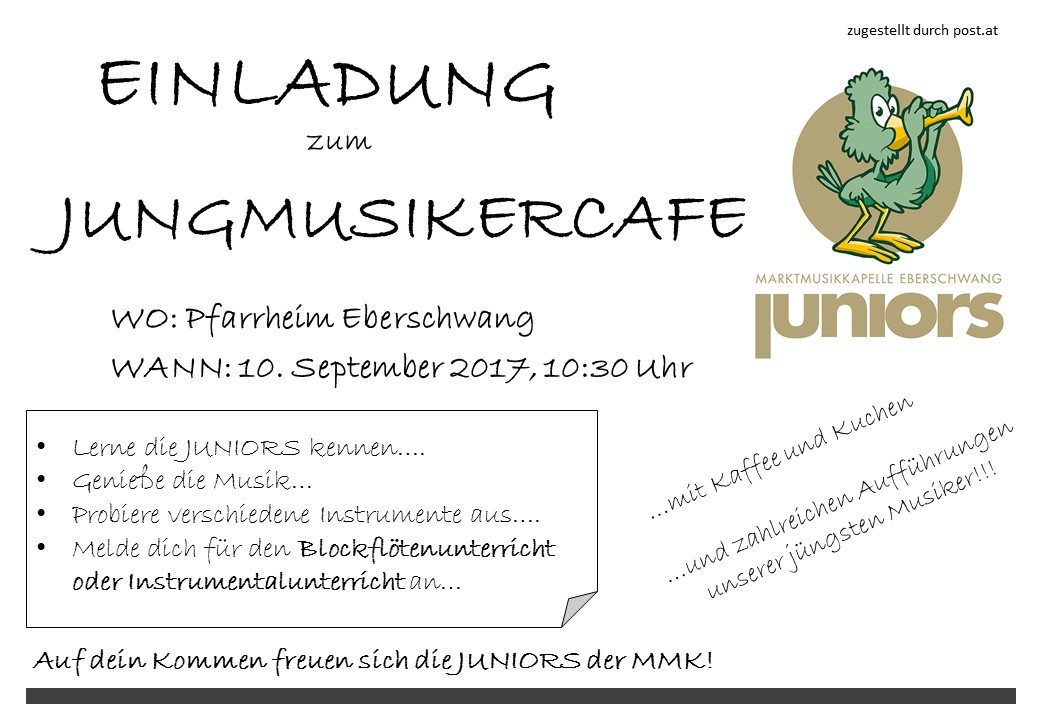 Am Sonntag, 10. September 2017 möchten wir Euch alle sehr herzlich zum Jungmusikercafe ins Pfarrheim einladen. Bei Kuchen und Kaffee zeigen unsere Jüngsten ihr Talent! Beginn 10:30 Uhr!